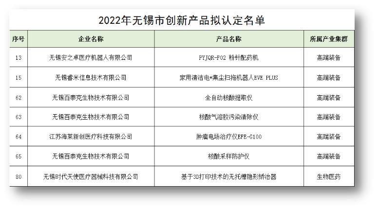 日前,市工信局的2022年無錫市創(chuàng)新產(chǎn)品擬認定名單公示結束,全市共有126企業(yè)的159個產(chǎn)品入選。生命園的安之卓醫(yī)療、睿米信息、時代天使、海萊新創(chuàng)、百泰克生物5家企業(yè)的7個產(chǎn)品入選,其中,百泰克一舉入選3個產(chǎn)品。