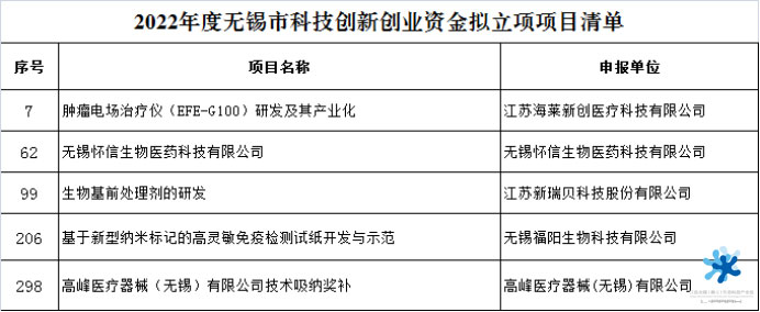日前,無(wú)錫市科技局先后公布兩批2022年度無(wú)錫市科技創(chuàng)新創(chuàng)業(yè)資金立項(xiàng)項(xiàng)目清單。首批全市373個(gè)項(xiàng)目獲立項(xiàng),生命園海萊新創(chuàng)、懷信生物、瑞貝科技、福陽(yáng)生物、高峰醫(yī)療5家企業(yè)的項(xiàng)目入選;生物醫(yī)藥產(chǎn)業(yè)專項(xiàng)全市共48個(gè)項(xiàng)目入選,園區(qū)端源醫(yī)療、倍達(dá)醫(yī)療、康萊醫(yī)療、茵絡(luò)醫(yī)療4家企業(yè)的5項(xiàng)目獲立項(xiàng)。