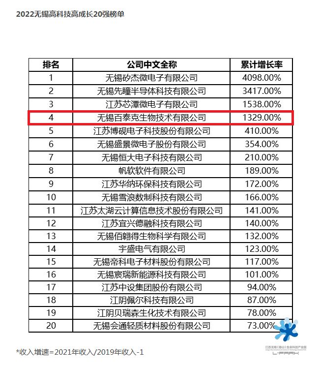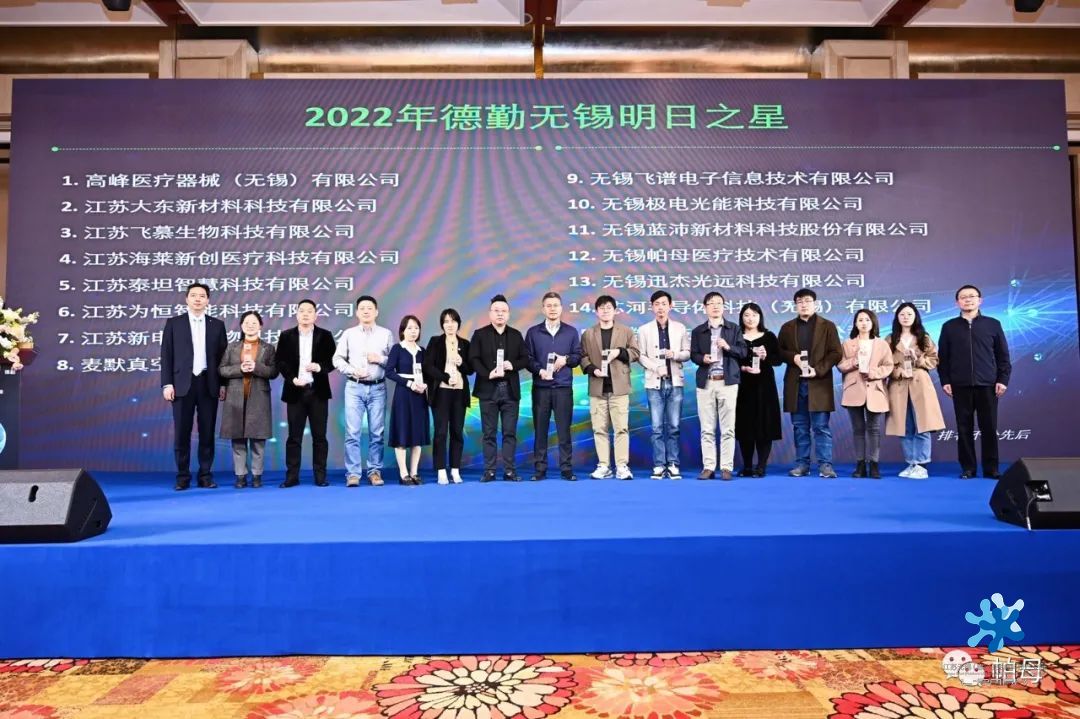 2023年4月3日,由無(wú)錫經(jīng)濟(jì)開發(fā)區(qū)與德勤中國(guó)聯(lián)合主辦,無(wú)錫雪浪小鎮(zhèn)未來(lái)園區(qū)協(xié)辦,“2022德勤無(wú)錫高科技高成長(zhǎng)20強(qiáng)及明日之星”頒獎(jiǎng)典禮在君來(lái)世尊酒店隆重舉行,榮獲20強(qiáng)和明日之星的35家企業(yè)負(fù)責(zé)人出席接受授獎(jiǎng)?;萆缴鼒@一舉囊括頒獎(jiǎng)項(xiàng)目的1/7,其中百泰克生物上榜2022無(wú)錫高科技高成長(zhǎng)20強(qiáng),位列第4,高峰醫(yī)療、海萊新創(chuàng)、麥默真空和帕母醫(yī)療同時(shí)入選明日之星。
