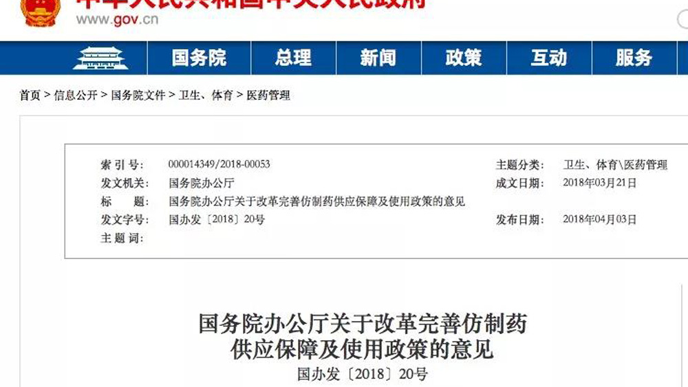 國(guó)務(wù)院辦公廳印發(fā)《關(guān)于改革完善仿制藥供應(yīng)保障及使用政策的意見》