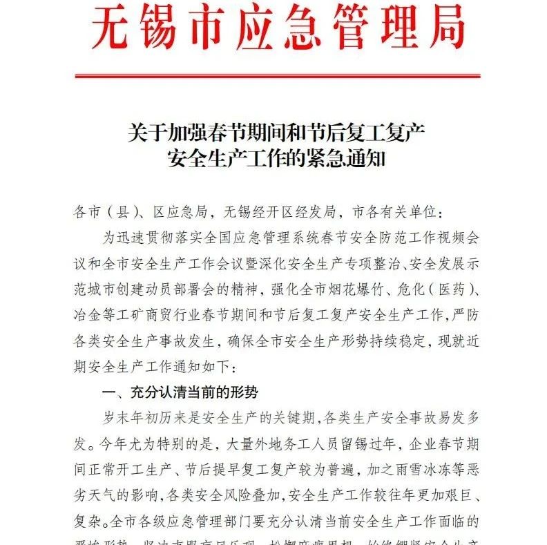 無(wú)錫市應(yīng)急管理局關(guān)于加強(qiáng)春節(jié)期間和節(jié)后復(fù)工復(fù)產(chǎn)安全生產(chǎn)工作的緊急通知