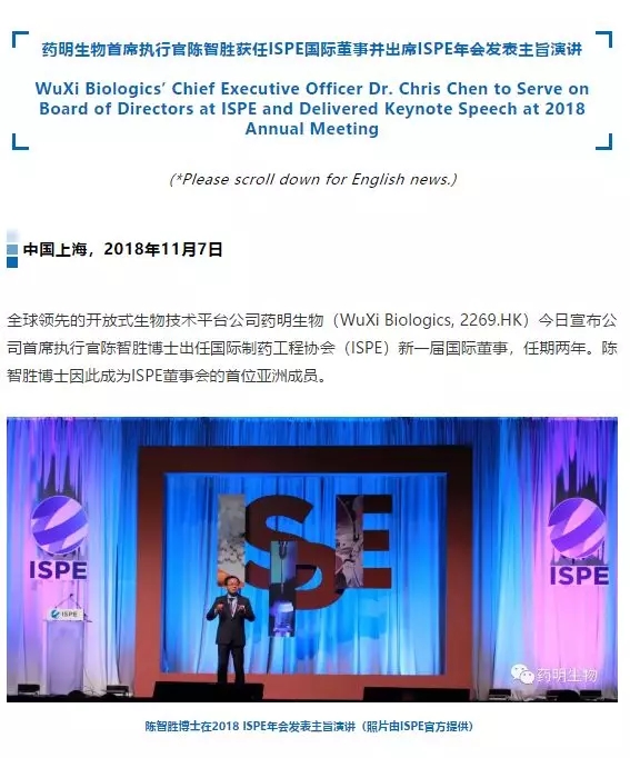 ISPE年會 | 藥明生物CEO陳智勝博士獲任ISPE國際董事并發(fā)表主旨演講